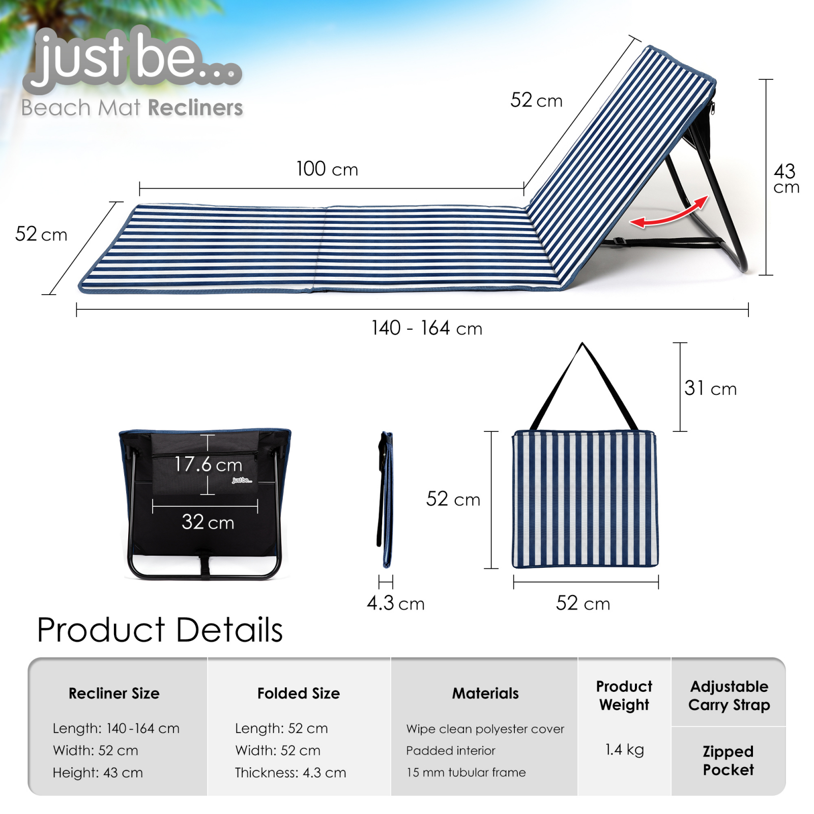 Descriere: Salteaua de plaja cu buzunar este ideala pentru relaxare la plaja, in parc, la un festival, sau, de ce nu, pentru a citi sau a face plaja in gradina. Fabricata din spuma la interior si o husa din poliester imprimat la exterior, care se curata prin stergere.Salteaua de plaja se poate inclina de la 100 cm pe orizonala, la 53 de cm atunci cand este rabatata. Salteaua este prevazuta cu o curea de umar pentru transport, un buzunar pentru depozitarea banilor, cheilor sau telefonului mobil si un cadru tubular usor de 15 mm pentru facilitarea transportului. Salteaua de plaja se pliaza pentru o solutie excelenta de economisire a spatiului pentru depozitarea acasa sau in masina. Dimensiuni: Lungimea saltelei intinse: 100 cm (lungime totala: 153 cm) Lungimea saltelei inclinate: 53cm Inaltime: 45cm Latime: 52cm Dimensiuni pliata: 52 x 52cm Greutate: 1,4 kg