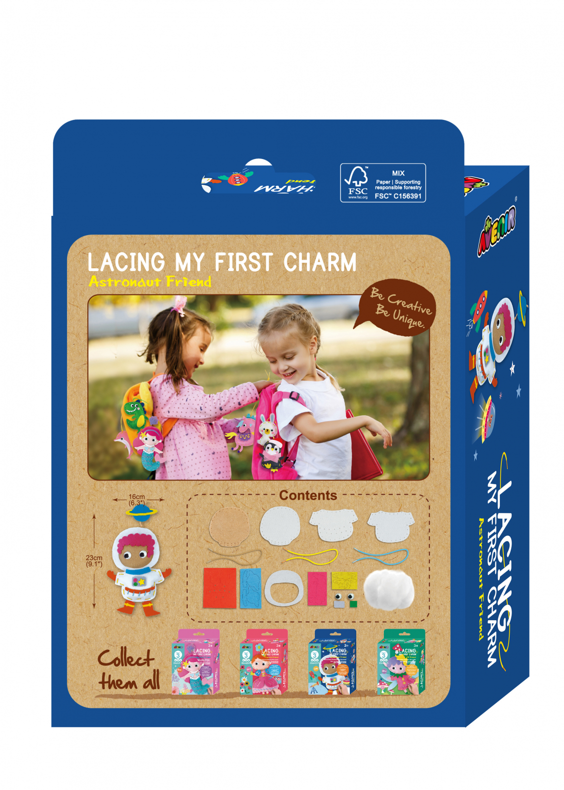 Copiii mici isi pot dezvolta acum abilitatile de cusut in timp ce se distreaza! Conceput pentru maini mai mici, cu fir gros de siret si gauri mari, Lacing My First Charm Astronaut Friends contine 1 personaj astronaut distractiv si usor de facut, cu care sa creati si sa va jucati. Acest kit contine 1 personaj adorabil cu tematica astronaut, impreuna cu foi de pasla pretaiate, autocolante decorative din pasla, ochi de plastic, umplutura din bumbac si sireturi colorate. Nu este nevoie de ac - foloseste un siret pentru a coase cele 2 bucati impreuna. Exersati abilitatile de insiretare si trasare. Folositi autocolante decorative din pasla pentru a decora. Conceput pentru a dezvolta abilitatile de coordonare ochi-mana si de concentrare. Pentru copii sa faca si sa ia peste tot! Pentru varsta de 3 ani +. Dimensiune cutie: 19.5 x 13 x 5 cm Linia de crafts prin insiretare de la Avenir are seturi pe 3 nivele de dificultate. Alege care se potriveste mai bine pentru copilul tau sau colecteaza-le pe toate.